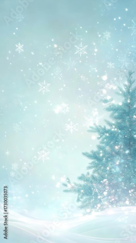 Festive Christmas Tree Background with Light Blue Sky Snowflakes and Glowing White Stars on the Right Side