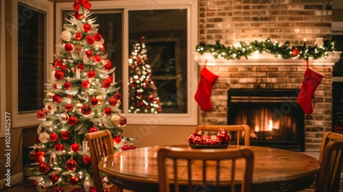 Festive Christmas Tree Decorated with Red Ornaments and Bokeh Lights on Wooden Table, Fireplace in Background, Perfect for Xmas Party or Event Banner Design.