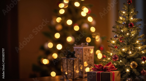 Festive Christmas Tree Display with Wrapped Presents on Wooden Table Holiday Illustration Background