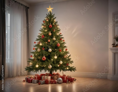 Festive Christmas tree with ornaments and lights, holly berries, holiday season