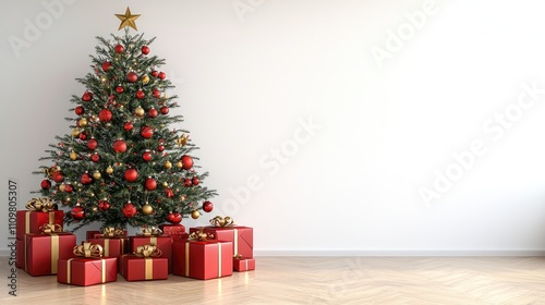 Festive Christmas Tree with Red and Gold Ornaments Surrounded by Wrapped Gifts in a Minimalist Living Room Setting
