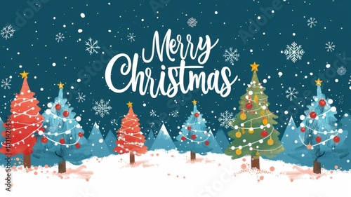Festive Christmas Trees with Snowfall and Merry Christmas Greeting