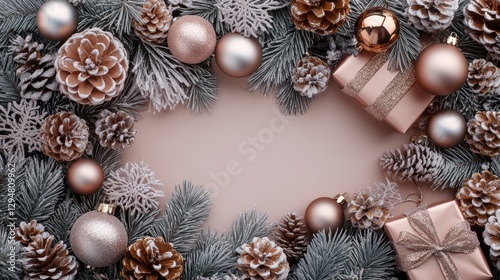 Festive christmas wreath with pine cones, baubles, and gifts in a winter holiday theme