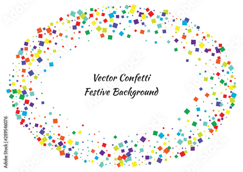 Festive color square confetti background. Abstract frame confetti texture for holiday, postcard, poster, website, carnival, birthday, children's parties. Cover confetti mock-up. Wedding card layout