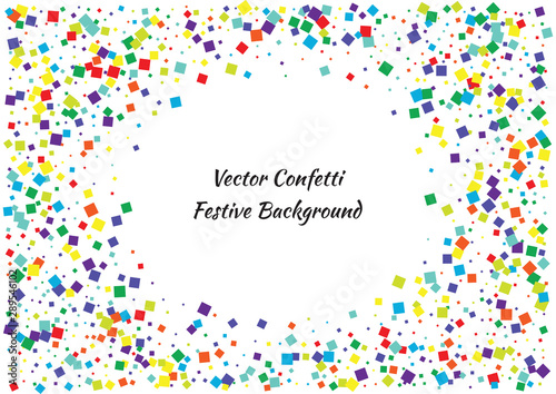 Festive color square confetti background. Abstract frame confetti texture for holiday, postcard, poster, website, carnival, birthday, children's parties. Cover confetti mock-up. Wedding card layout