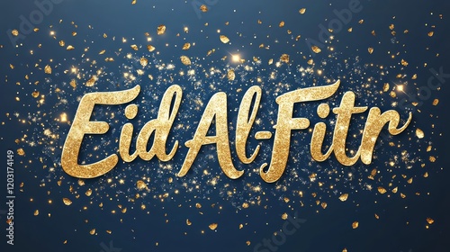 Festive dark background "Eid Al-Fitr" golden lettering and gold flakes, glitter particles. Islamic greeting card, Muslim spiritual poster for celebrating. Arabic phrase used to celebrate Eid al-Fitr.