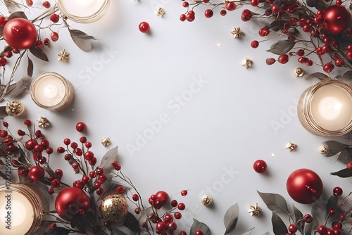 Festive decor arrangement with candles and red ornaments for holiday celebrations