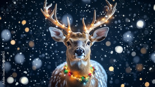 Festive deer with Christmas lights, winter background, perfect for holiday greeting cards