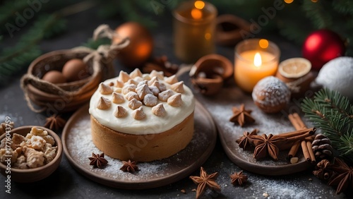 Festive dessert display with a cream-topped cake and seasonal decorations in a cozy setting during winter holidays Generative AI