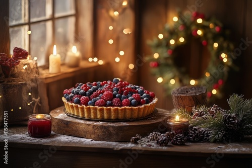 Festive Dessert with Berries and Candles Surrounded by Holiday Decorations in a Cozy Rustic Setting
