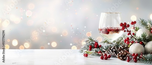 Festive drink setting with a glass filled with cranberries, surrounded by holiday greenery, shiny ornaments, and a soft, dreamy background of twinkling lights.