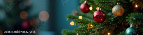 festive evergreen tree with ornaments and lights , snowflakes, winter wonderland, Christmas decor background