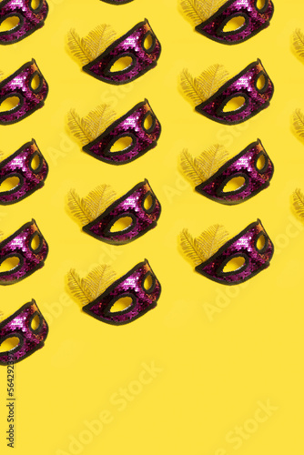 Festive face mask pattern for carnival or masquerade celebration on colored background. Vertical format