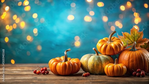 Festive fall greeting with pumpkins on a beautiful blue background, hello fall, pumpkins, autumn, seasonal, harvest, greeting