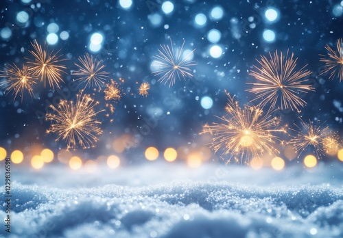 Festive Fireworks Illuminate a Winter Night Sky with Snowy Ground and Blurred Colorful Lights Creating a Magical Celebration Atmosphere
