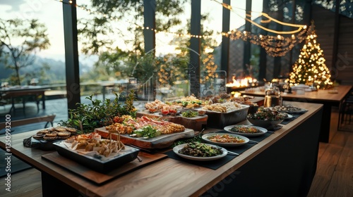Festive food setups cozy venue photography evening light wide shot joyful atmosphere with details
