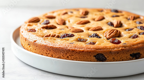 Festive fruitcake loaded with almonds, raisins, pecans, resting on white ceramic plate, showcasing holiday baking tradition