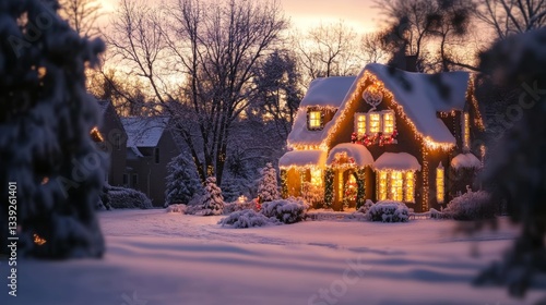 Festive gingerbread house illuminated at sunset in a charming suburban neighborhood