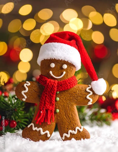 Festive Gingerbread Man in Santa Hat on Snow.