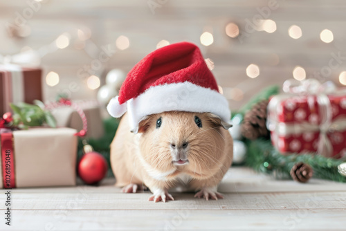 Festive Guinea Pig Wearing Santa Hat Amidst Wrapped Gifts, Ornaments, Celebrating Holiday Spirit, Christmas Joy Concept