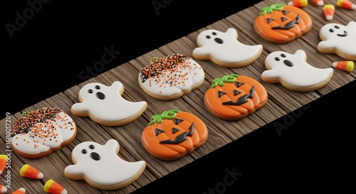 Festive Halloween Treats: A delightful assortment of handcrafted Halloween cookies, including smiling ghosts, grinning jack-o'-lanterns, and sprinkled sugar cookies, arranged on a wooden surface.
