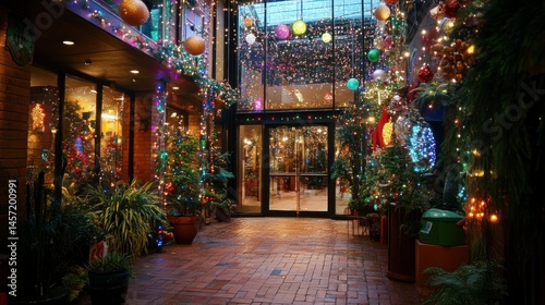 Festive hallway adorned with holiday lights and decorative ornaments displays