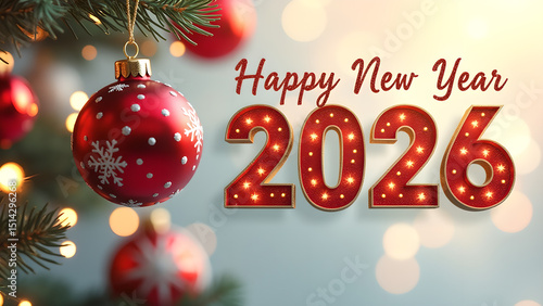 Festive Happy New Year 2026 background with Christmas ornament and light effects