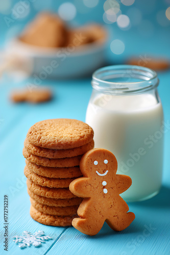 Festive Holiday Cookies and Milk Snack: Cheerful Gingerbread Man with Stacked Gingerbread Treats Against Blue Background