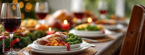 Festive holiday dinner setting with roasted chicken, vegetables, and wine at a beautifully decorated table