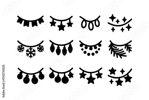 Festive holiday garlands set in simple silhouette style for seasonal decorations