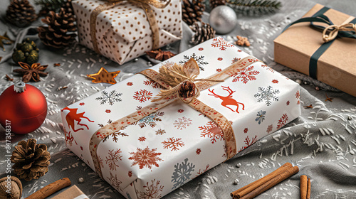 Festive Holiday giftbox Setting with Red and White Christmas-Themed Linens