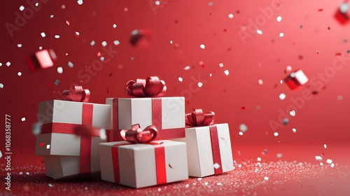 Festive holiday gifts with red bows surrounded by colorful confetti.