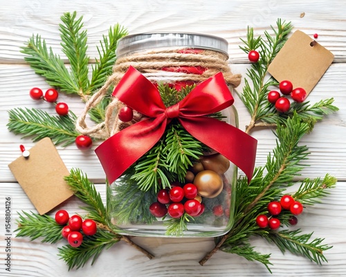 Festive Holiday Jar: A charming holiday scene featuring a decorated mason jar filled with festive elements like berries and ornaments.