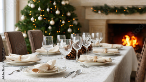Festive holiday table adorned with decorations, fireplace glowing, Christmas tree sparkling in warm interior background