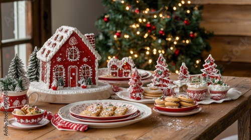 Festive Holiday Table Set With Gingerbread Houses and Cookies for Winter Celebration