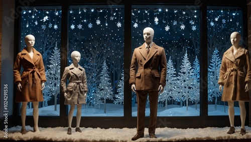Festive Holiday Window Display with Mannequins in Winter Attire Amid Christmas Decorations and Twinkling Lights