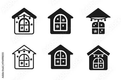 Festive Home Logos. Decorating the house together for the holidays. Set Logo of festive home: window with snowflakes and lights. Icon set. harmonious logo