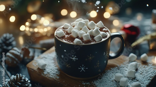 Festive Hot Chocolate with Marshmallows and a Winter Wonderland Background