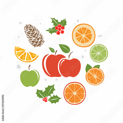 Festive illustration featuring apples, oranges, holly, a pinecone, and snowflakes.