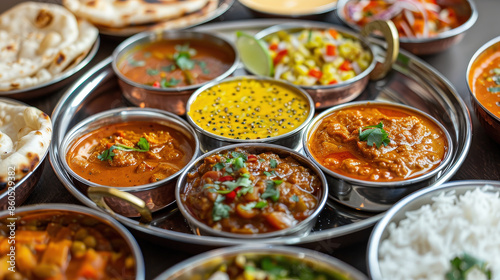 Festive Indian Thali: Vibrant Array of Dal, Curry, Roti, Rice, and Chutneys in Stainless Steel Platter
