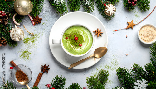 Festive Matcha Latte with Christmas Decorations: Cozy Holiday Drink.