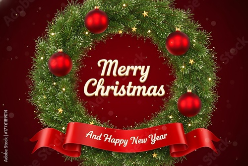Festive merry christmas wreath with red ornaments and ribbon festive greetings and happy new year celebration