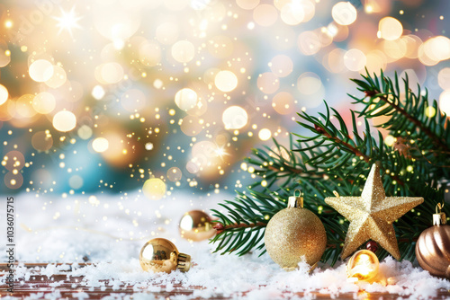Festive navy background with Christmas tree, stars, gold glitter, snowflakes, de focused. Mocap, banner, card, invitation, template, with sparkle, blurry lights, bokeh. Selective focus. Copy space