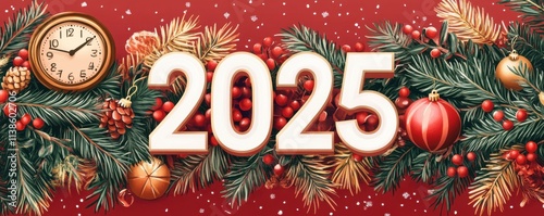 Festive new year 2025 design with clock and Christmas decorations in red and gold. Celebrate the upcoming year