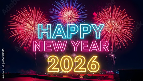 Festive new year celebration with vibrant fireworks and illuminated text reading happy new year 2026