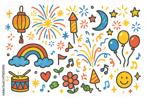 Festive Night Doodles. Colorful Hand-drawn doodle Children illustration festival night fireworks lantern, fireworks, stars, moon, rainbow, heart, confetti,