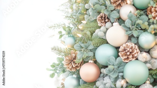Festive Ornament Elegance: Exquisite Christmas ornaments adorn a verdant bough, creating a scene of seasonal serenity. Emitting a sense of tradition and joy.