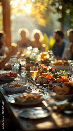 Festive Outdoor Dinner Party Delicious Food Golden Hour Sunlight and Happy Guests
