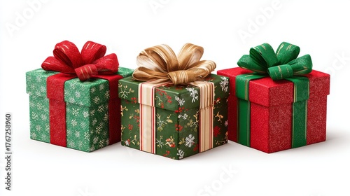 Festive pile of realistic christmas gift boxes wrapped in colorful paper with shiny ribbons and bows stacked in a decorative pyramid on a clean white background for holiday celebration design
