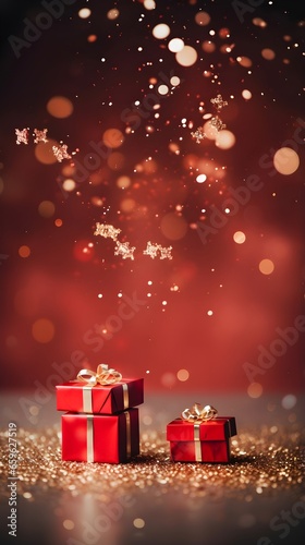 Festive present gift box with Christmas decorations. Abstract background with copy space.